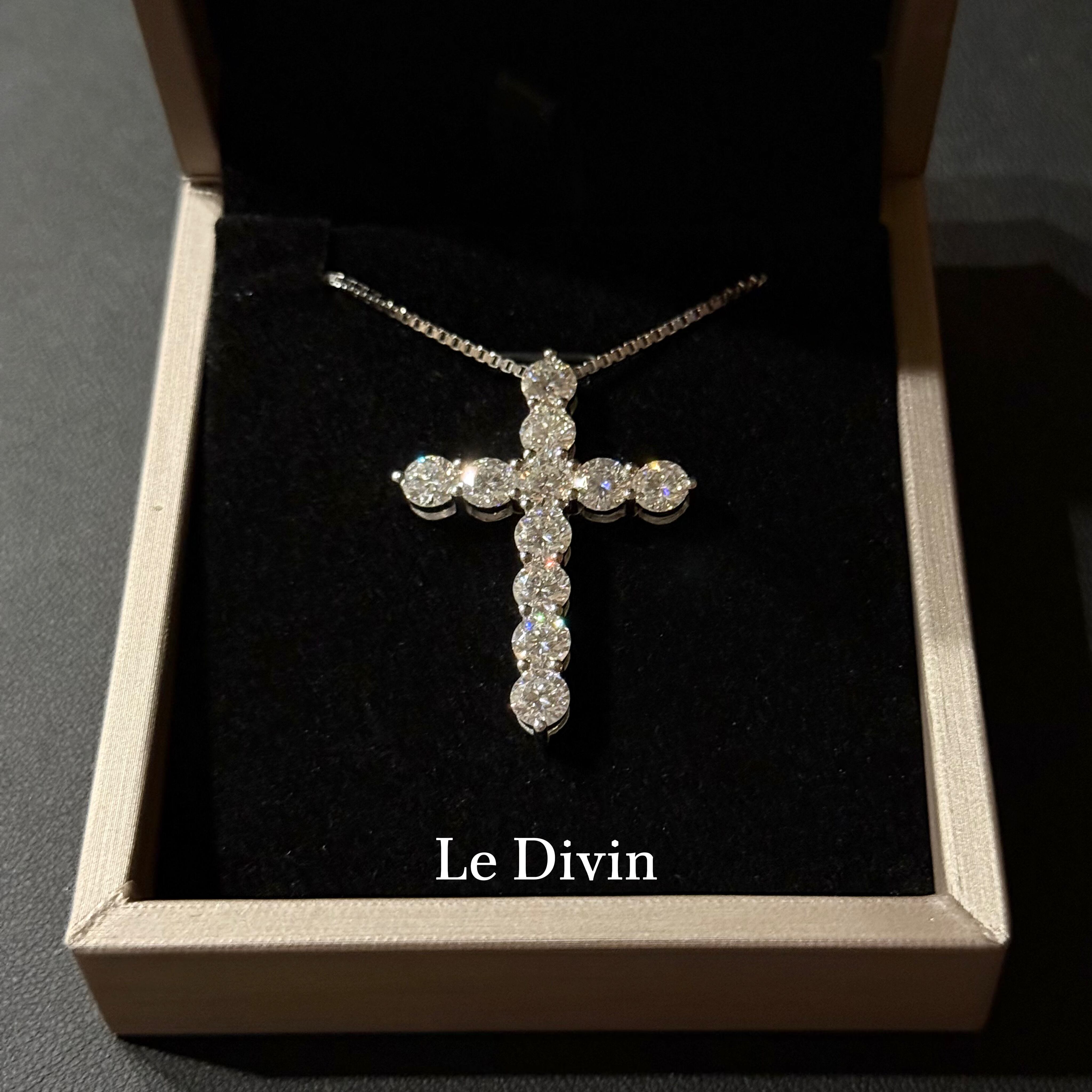 無駄を省いたシンプルなデザインが魅力のユニセックスクロスネックレスです。光が差し込む空間のある土台がモアサナイトの美しい輝きをより際立たせます。