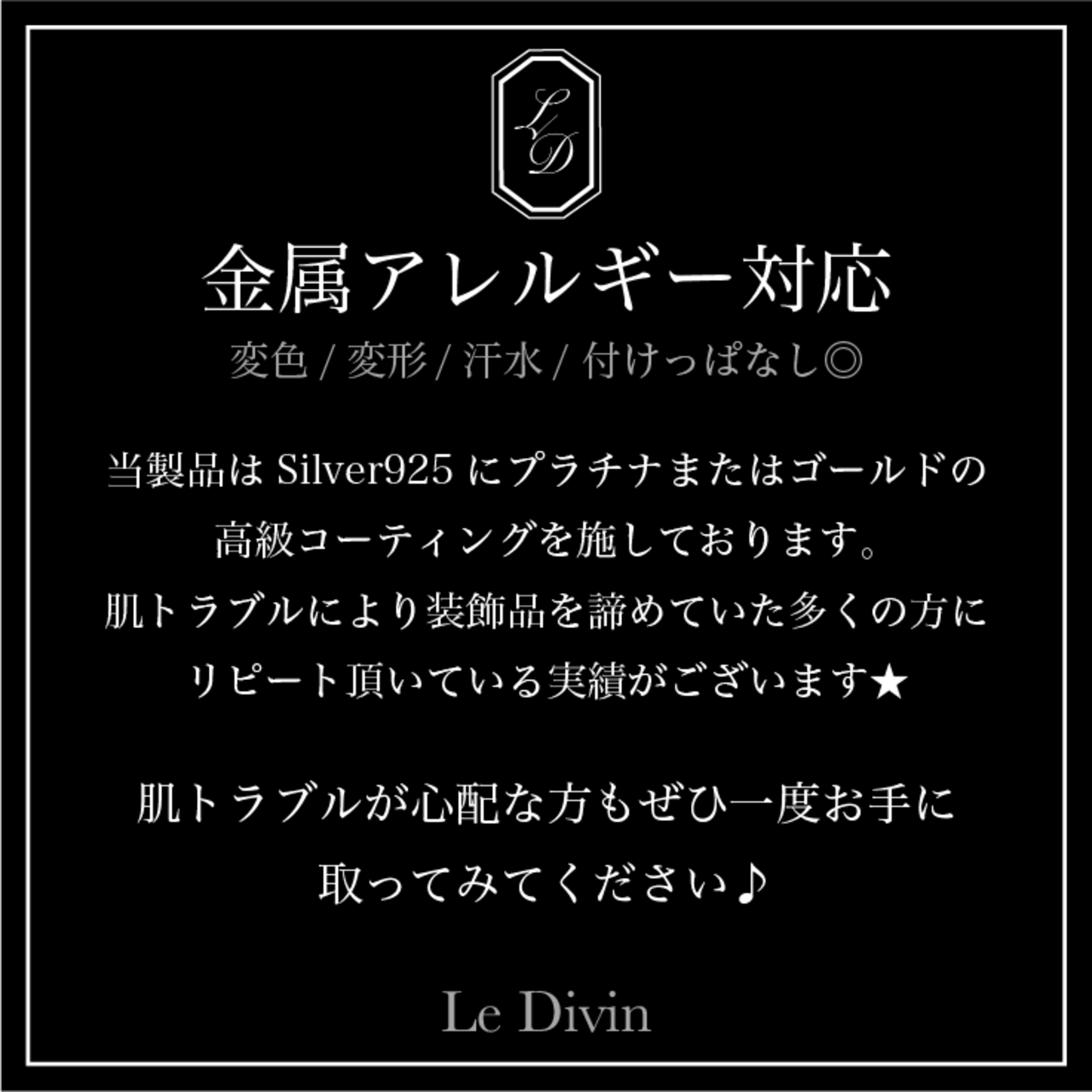 素材はSilver925にプラチナメッキ加工を施しており、変色や変形、汗水に強いだけでなく本物の高級貴金属のような艶やかで美しい輝きをお楽しみいただけます。金属アレルギーの方にもご愛用いただきやすい素材となっております。