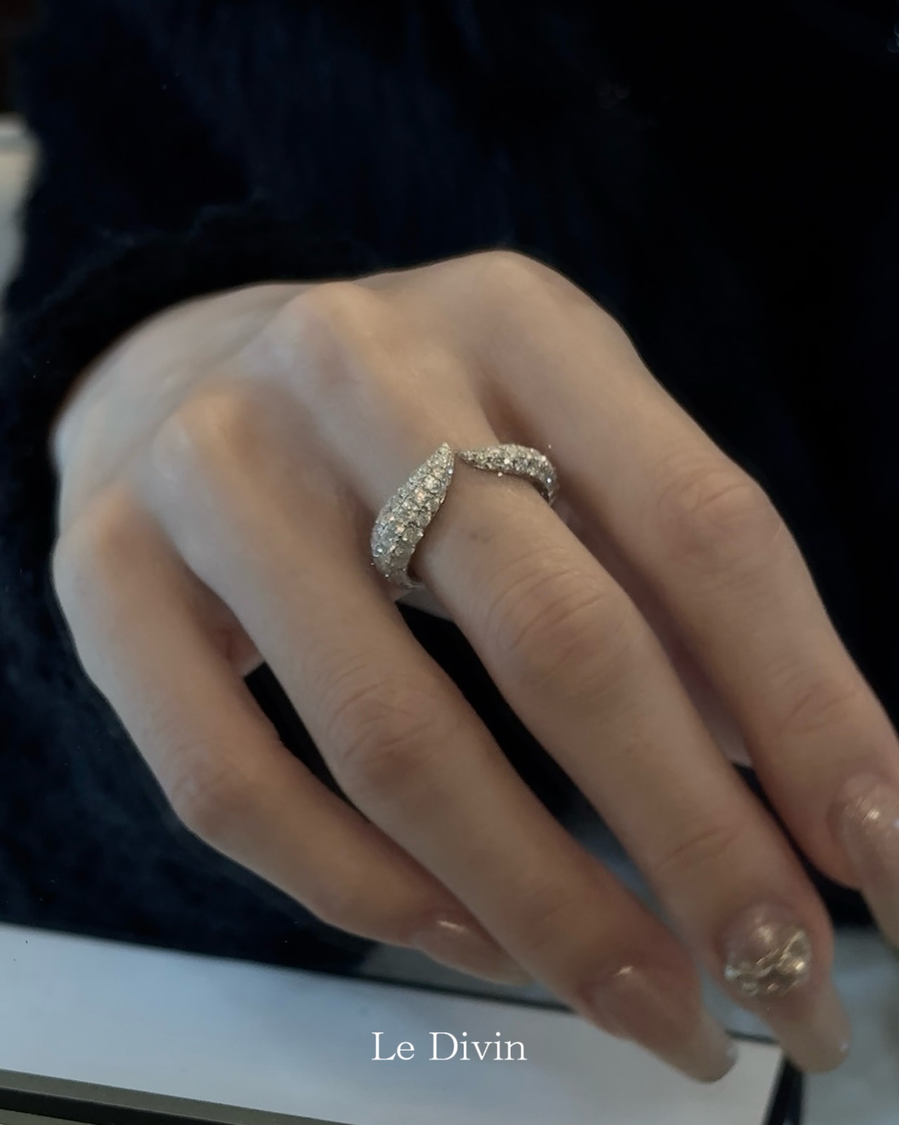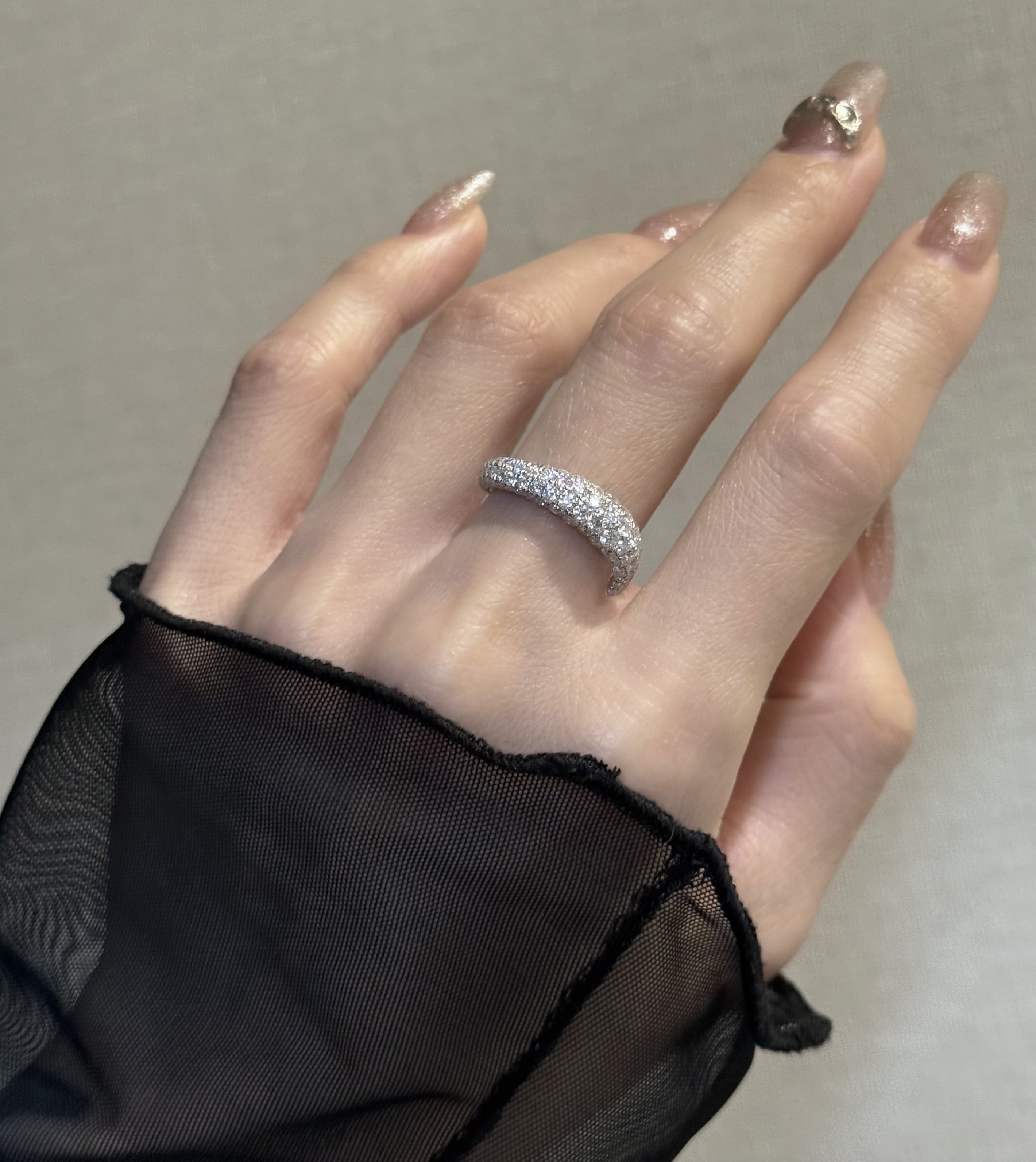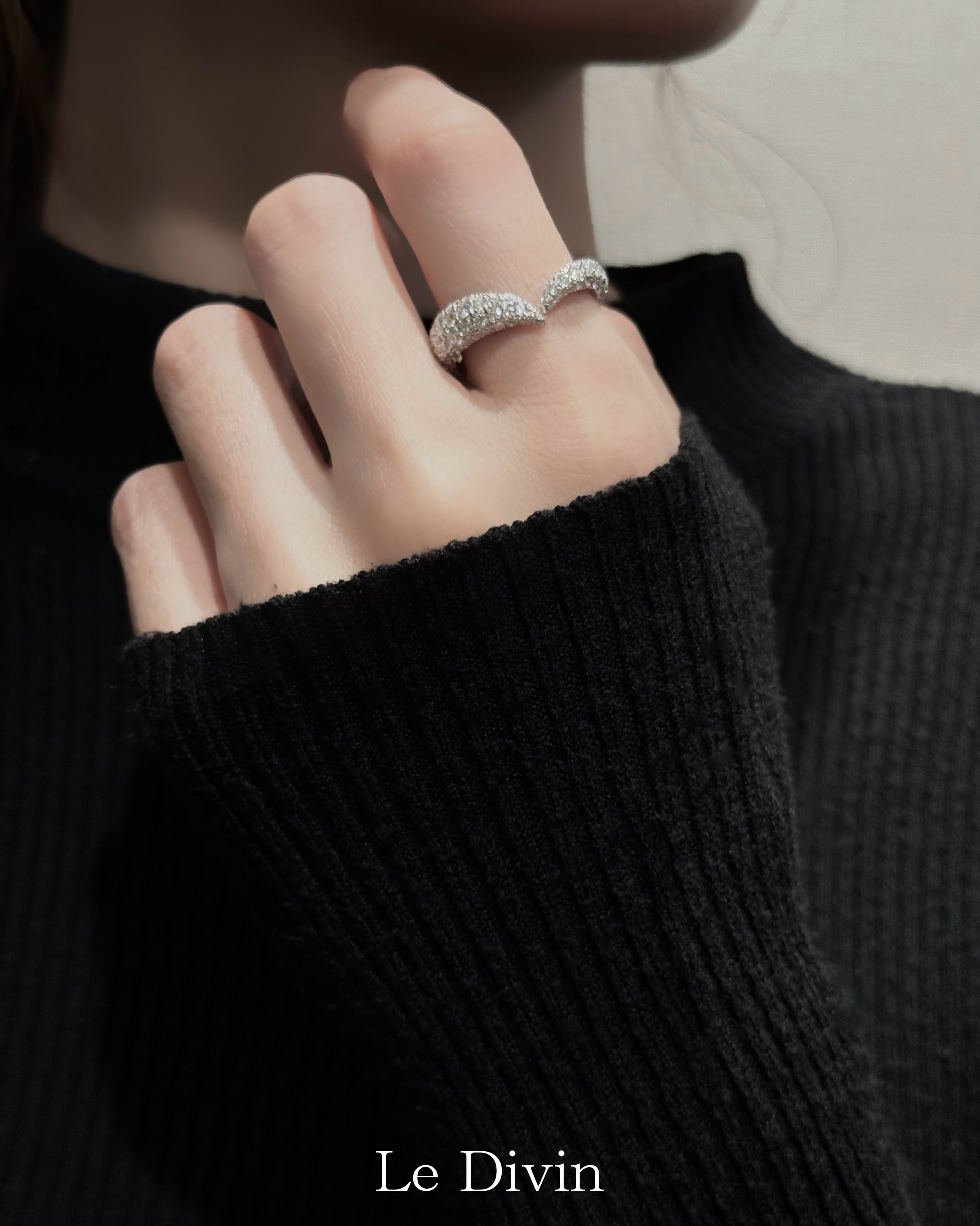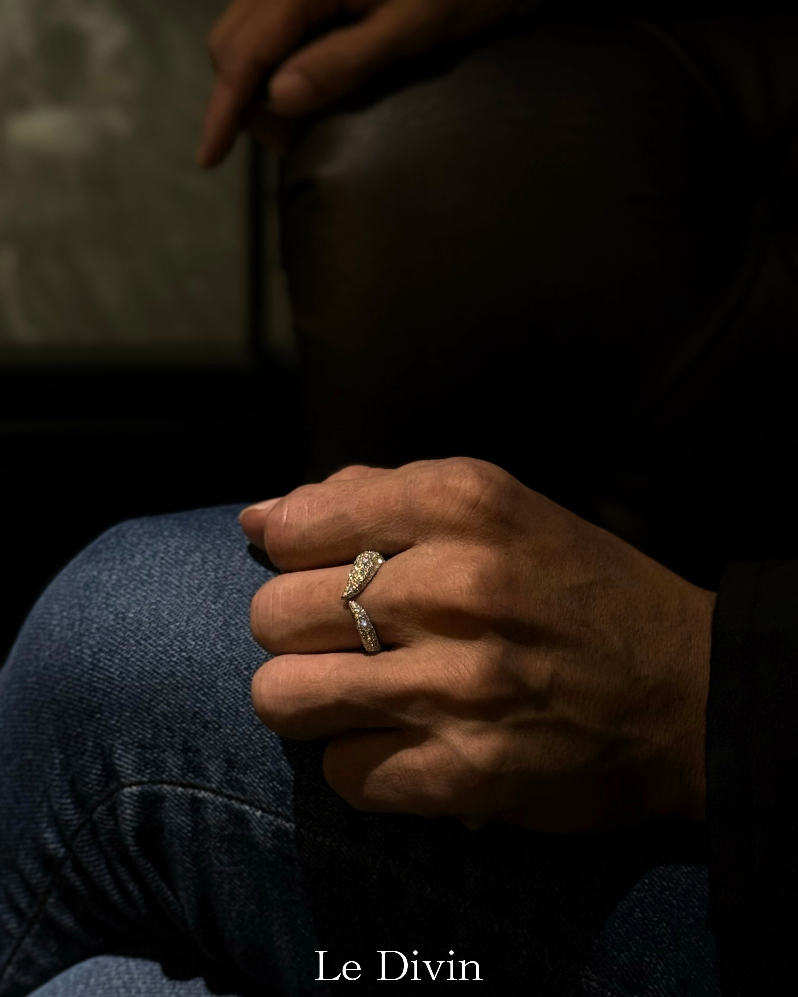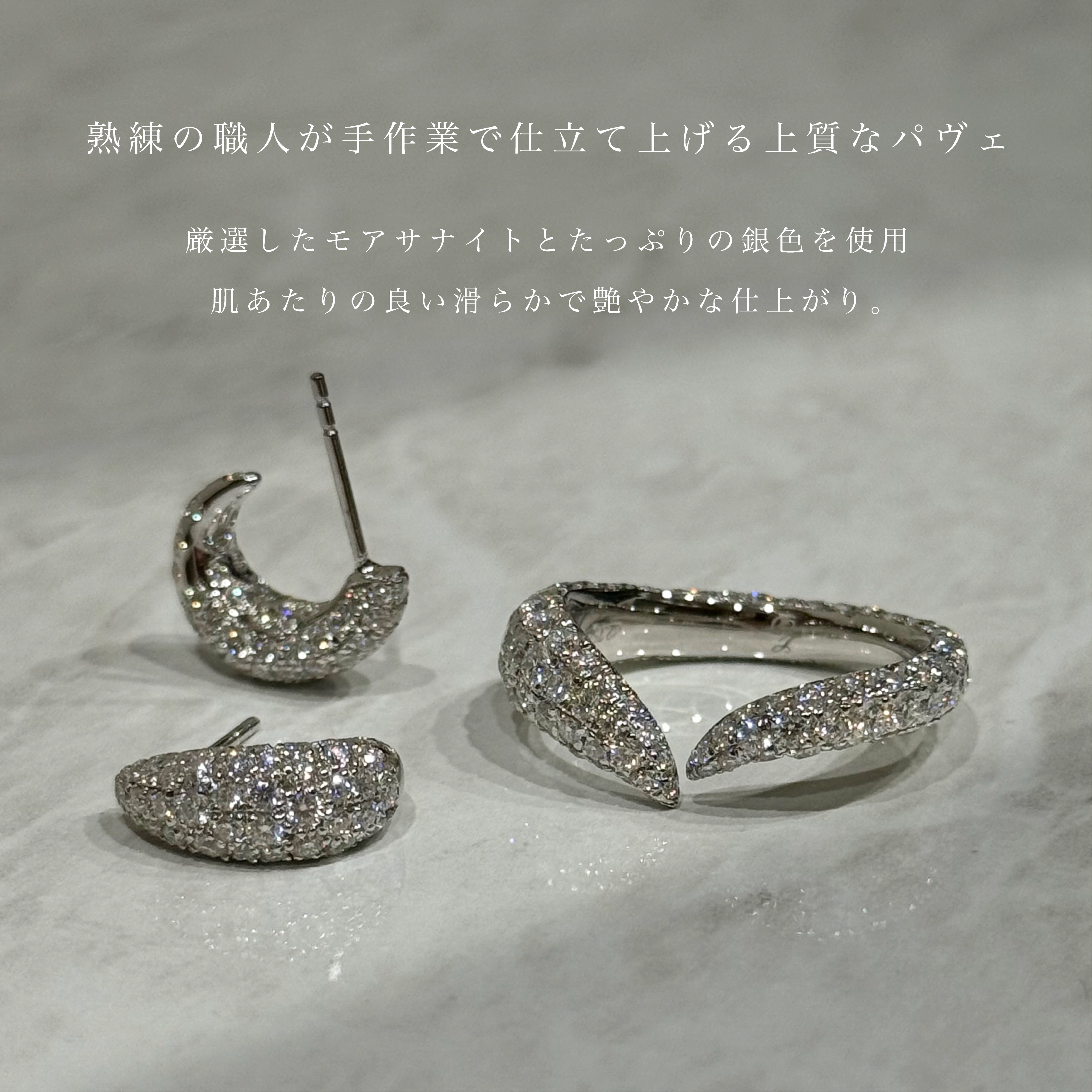しなやかな曲線にエッジの効いたトゲが魅力のパヴェフルエタニティリング。ランダムサイズのモアサナイトが一粒一粒、細やかな煌めきを放ち手元を彩ります。銀をたっぷりと使用しているので、程よい重みのある仕上がりでより高級感与えてくれます。