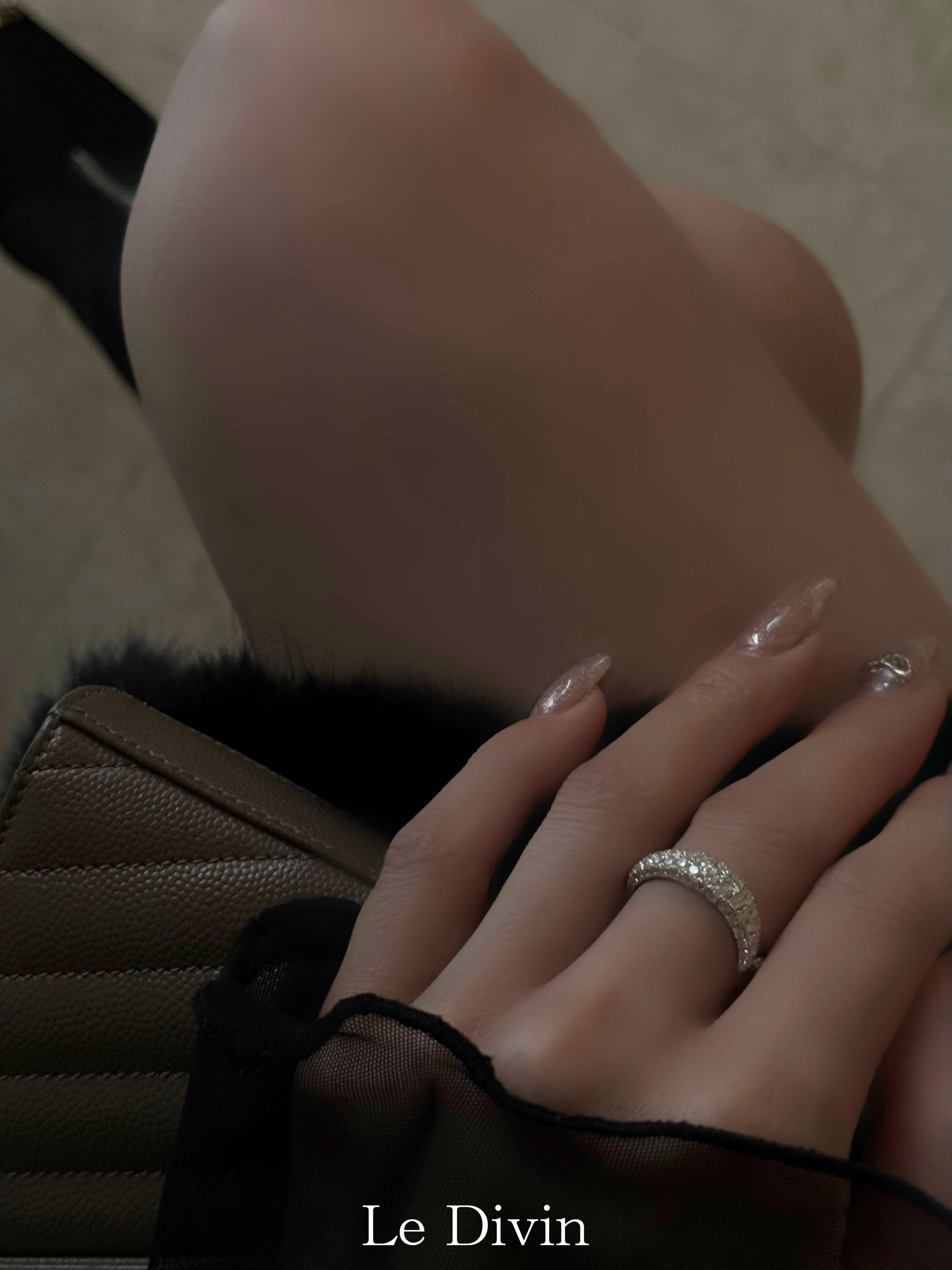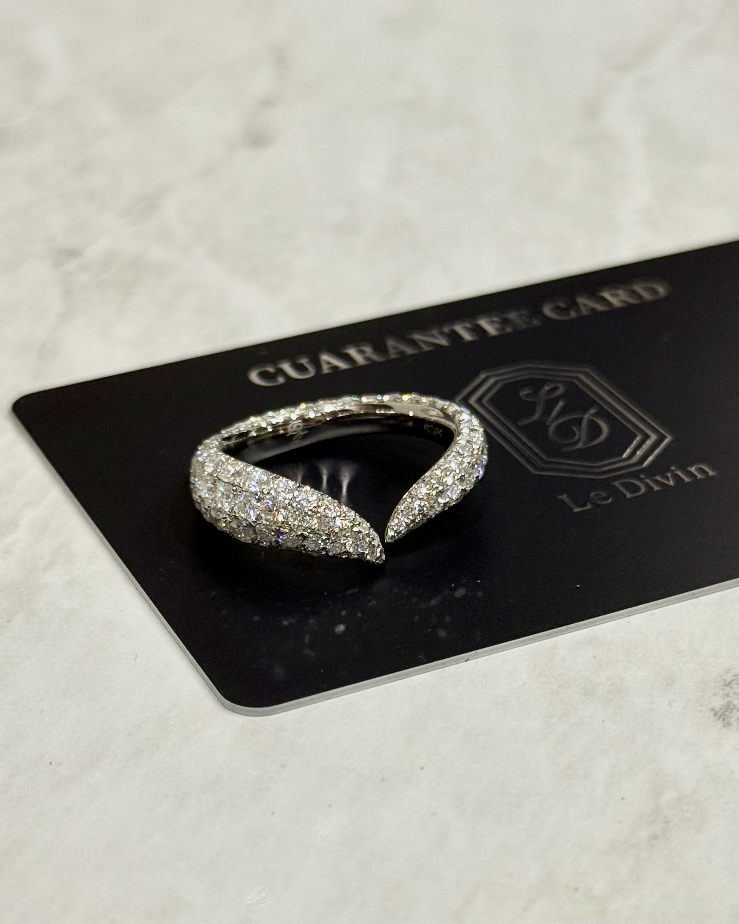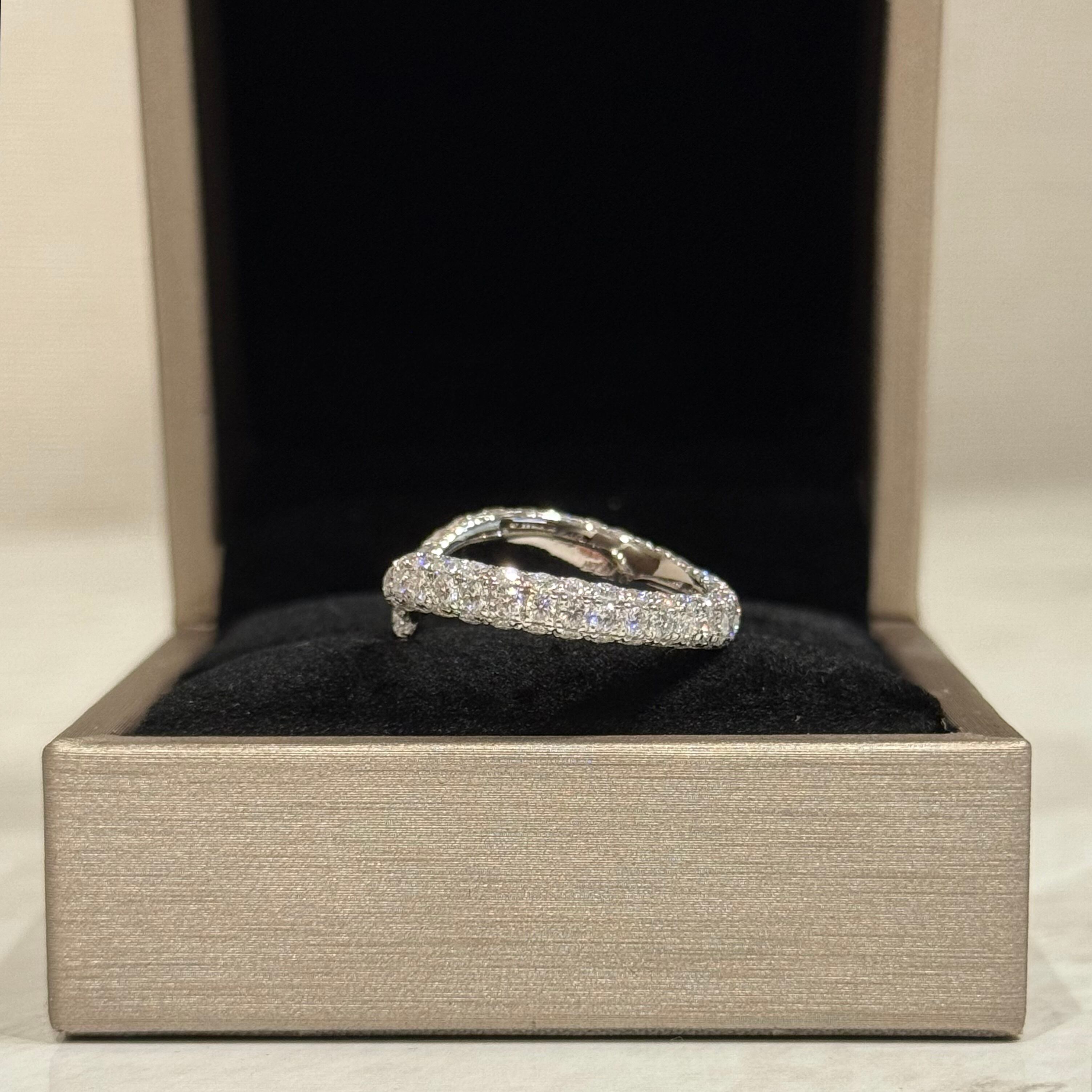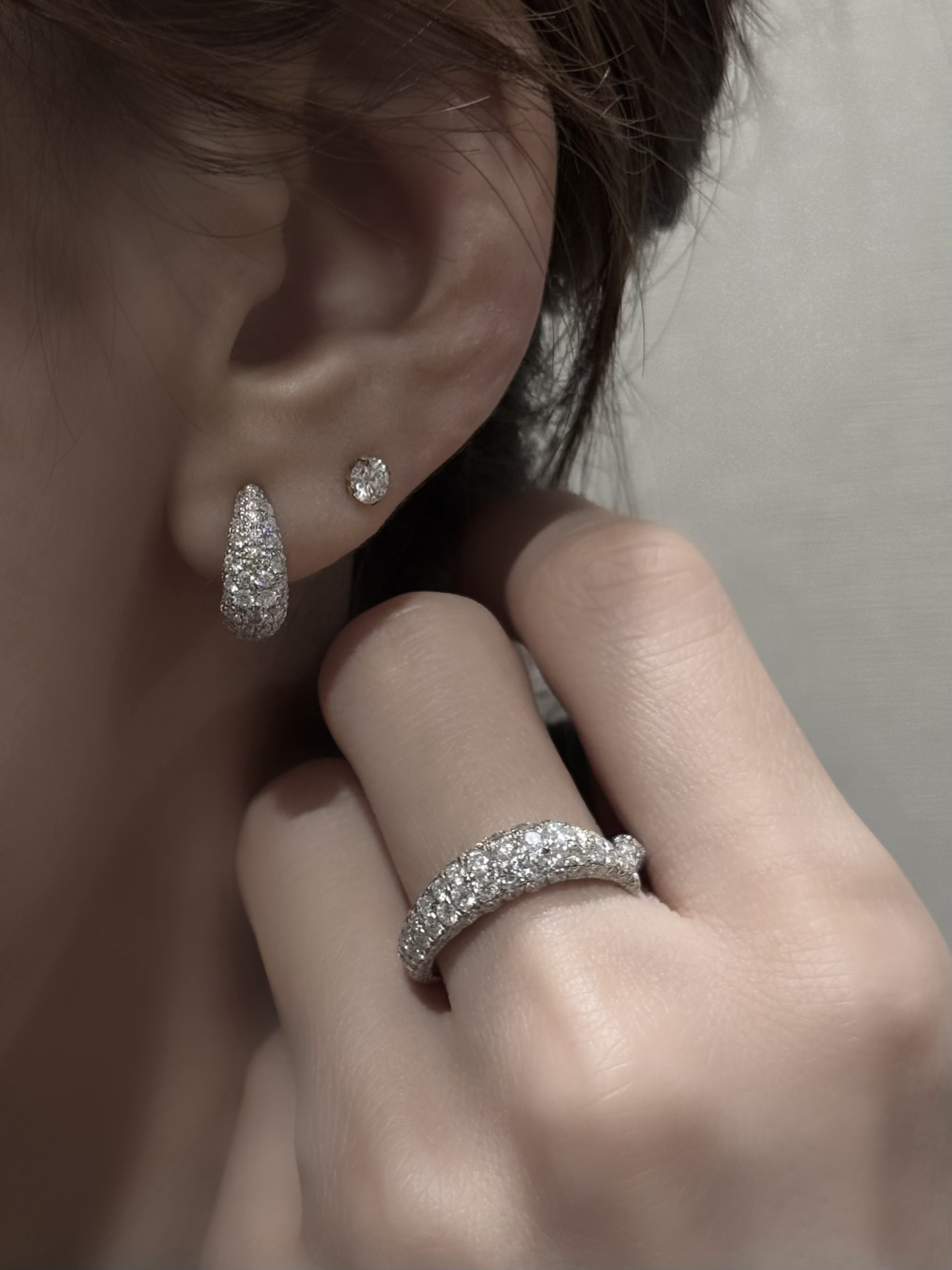 しなやかな曲線にエッジの効いたトゲが魅力のパヴェフルエタニティリング。ランダムサイズのモアサナイトが一粒一粒、細やかな煌めきを放ち手元を彩ります。銀をたっぷりと使用しているので、程よい重みのある仕上がりでより高級感与えてくれます。