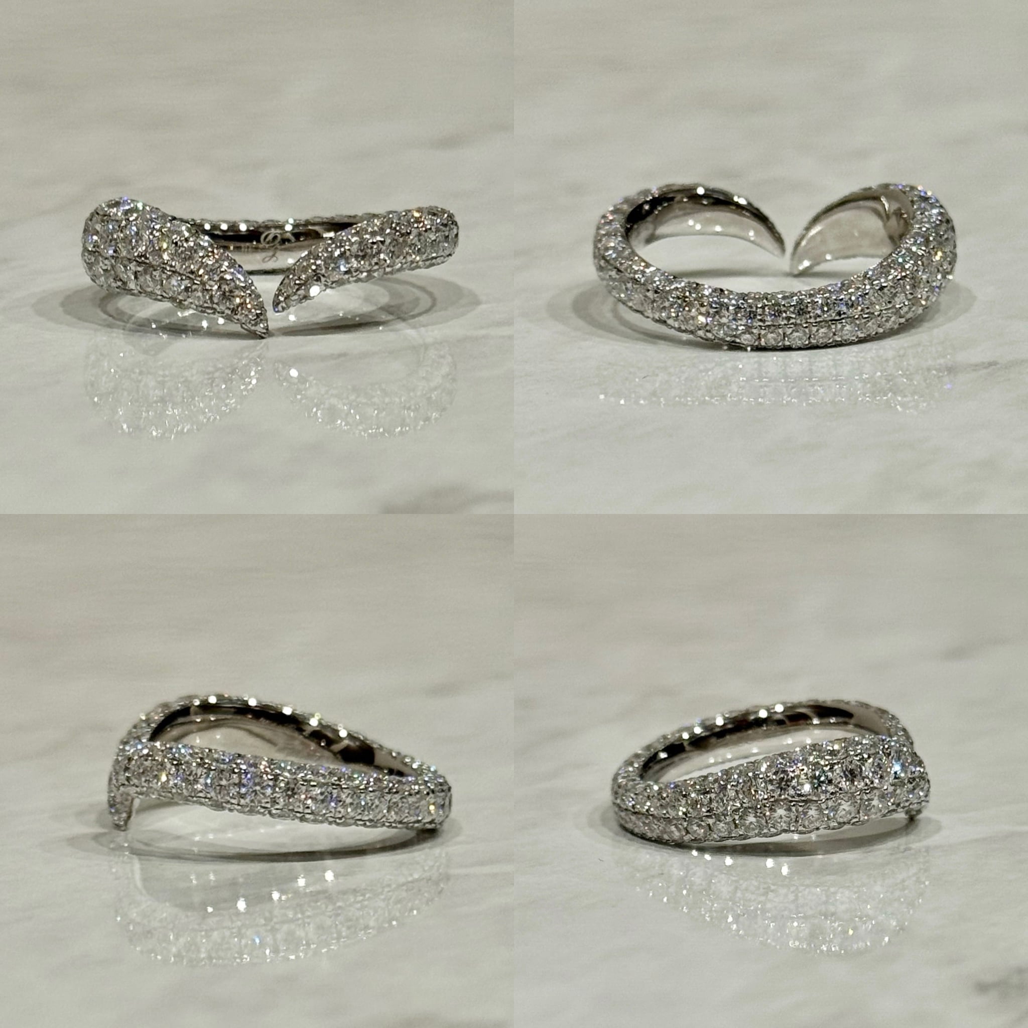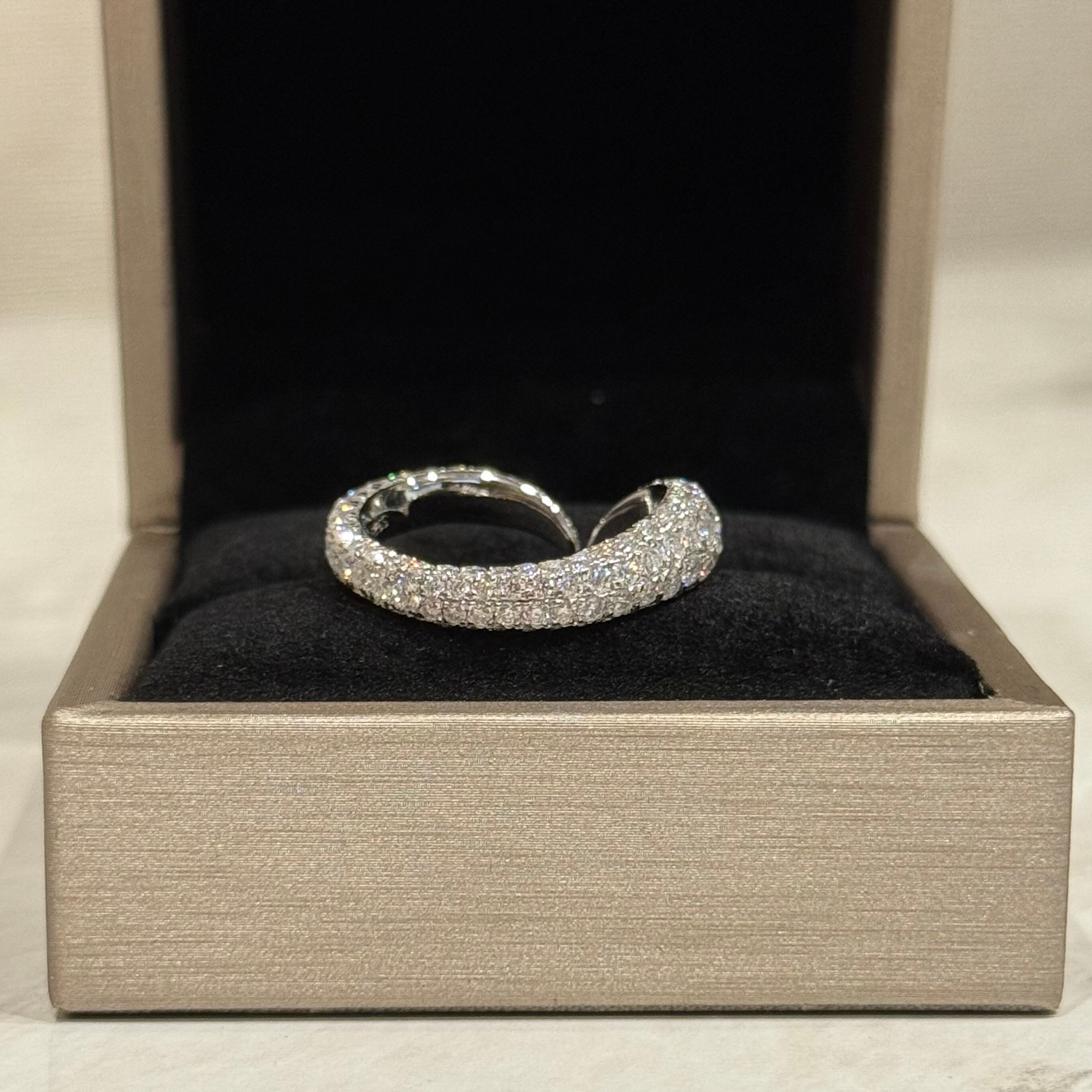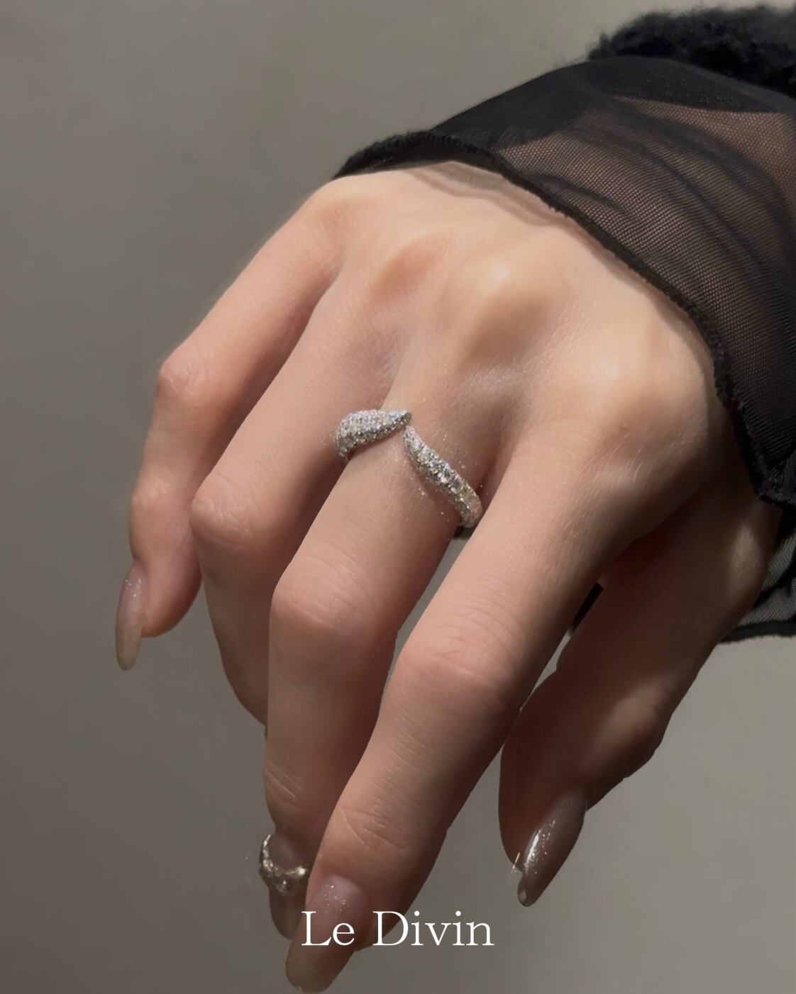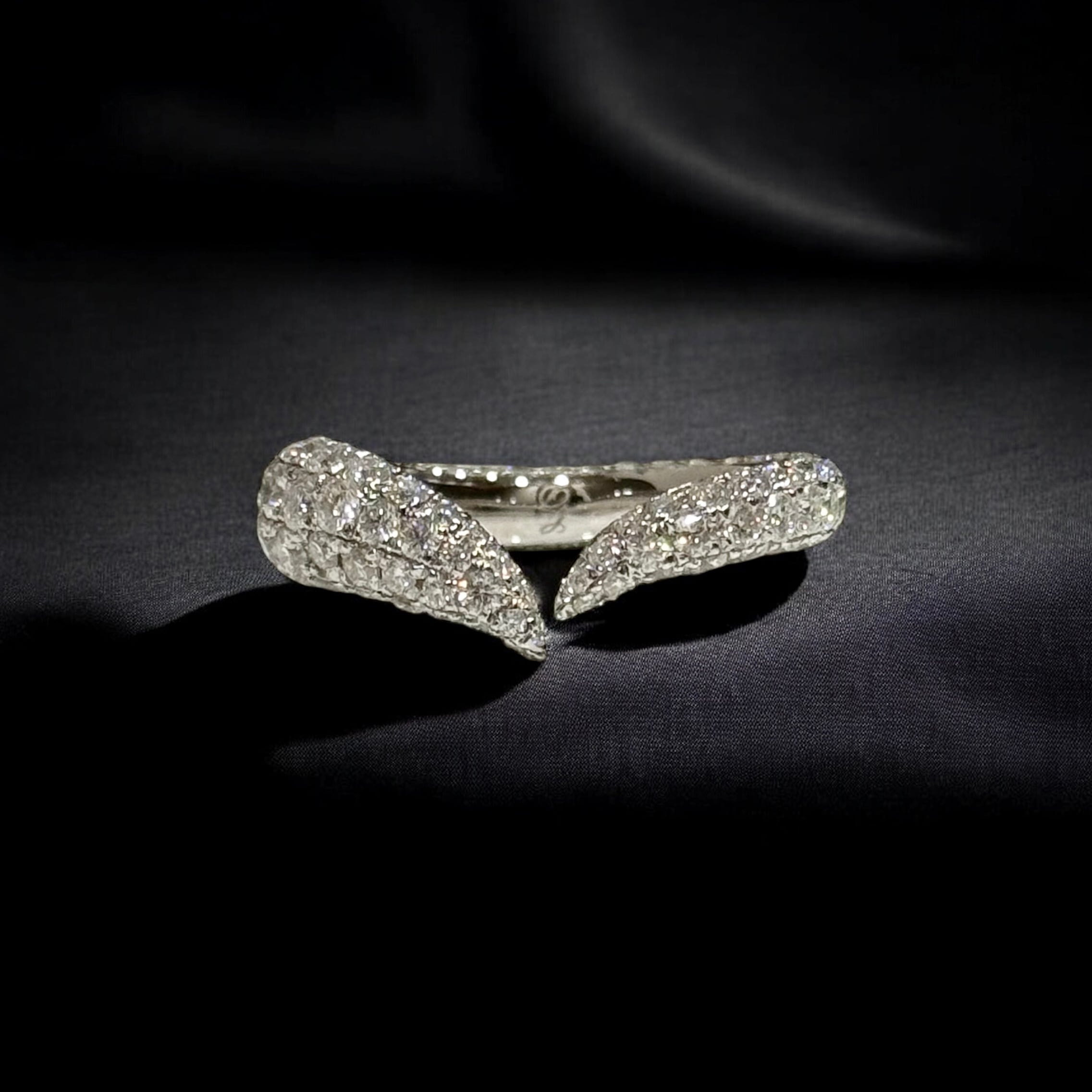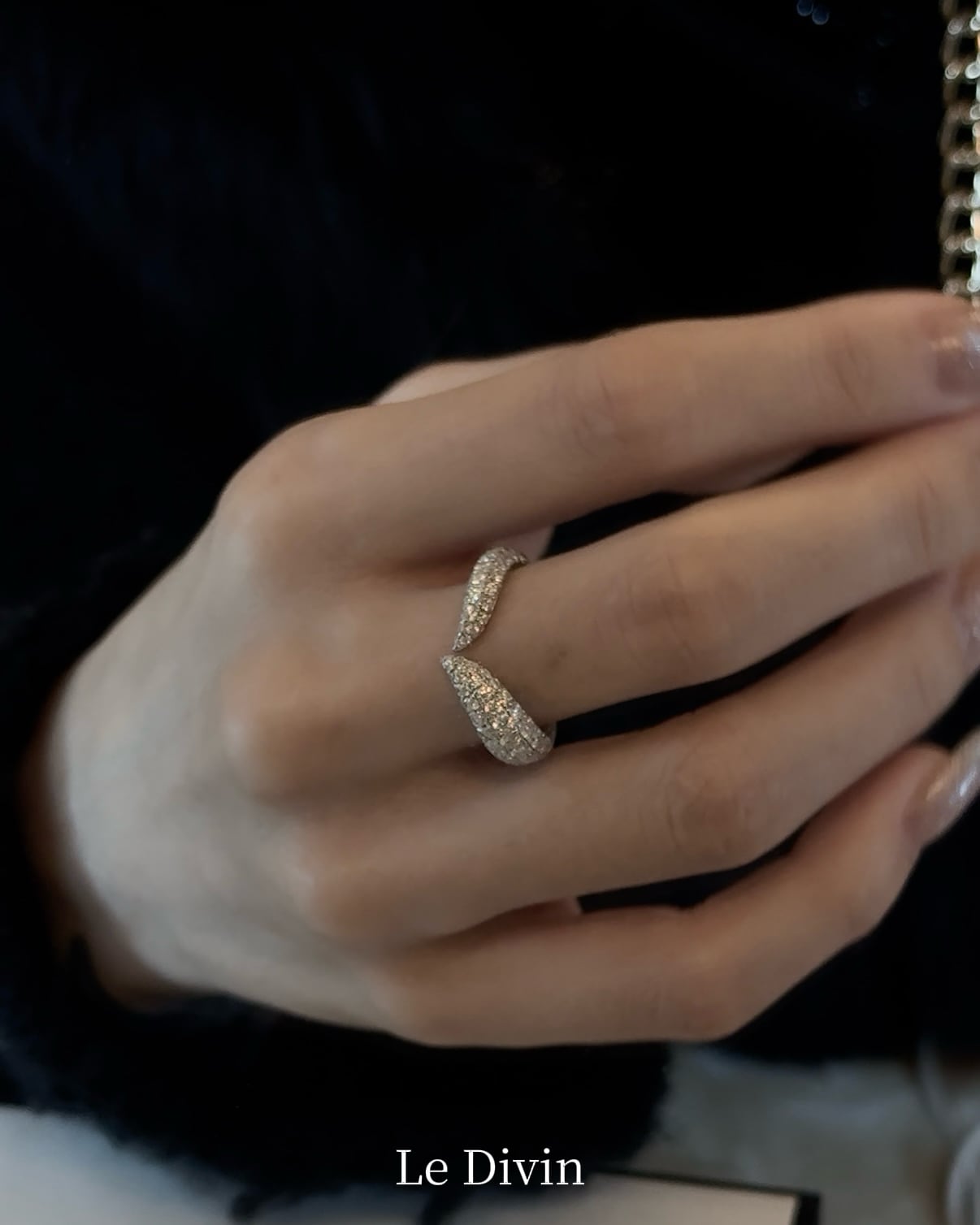 しなやかな曲線にエッジの効いたトゲが魅力のパヴェフルエタニティリング。ランダムサイズのモアサナイトが一粒一粒、細やかな煌めきを放ち手元を彩ります。銀をたっぷりと使用しているので、程よい重みのある仕上がりでより高級感与えてくれます。