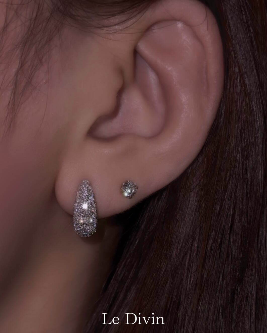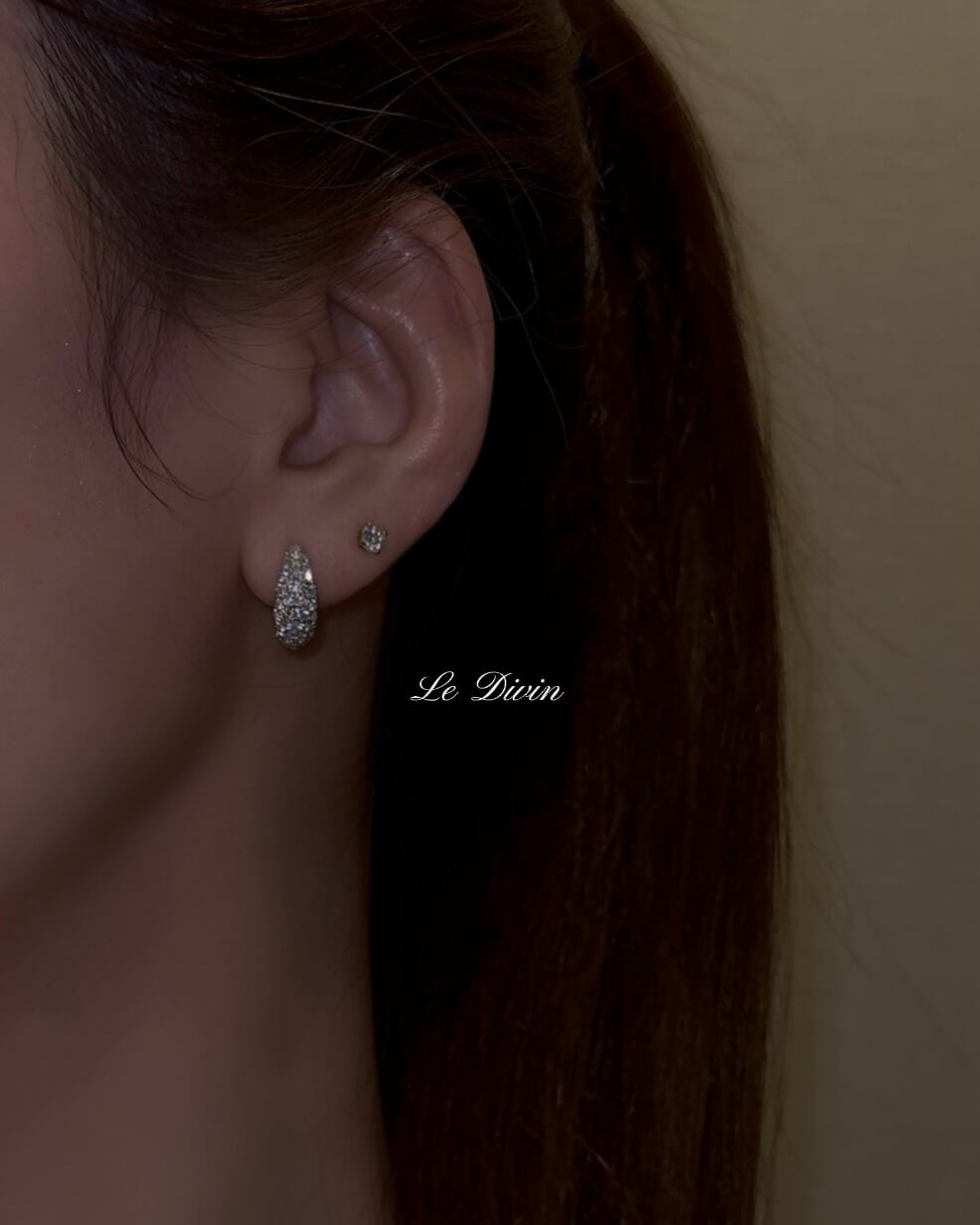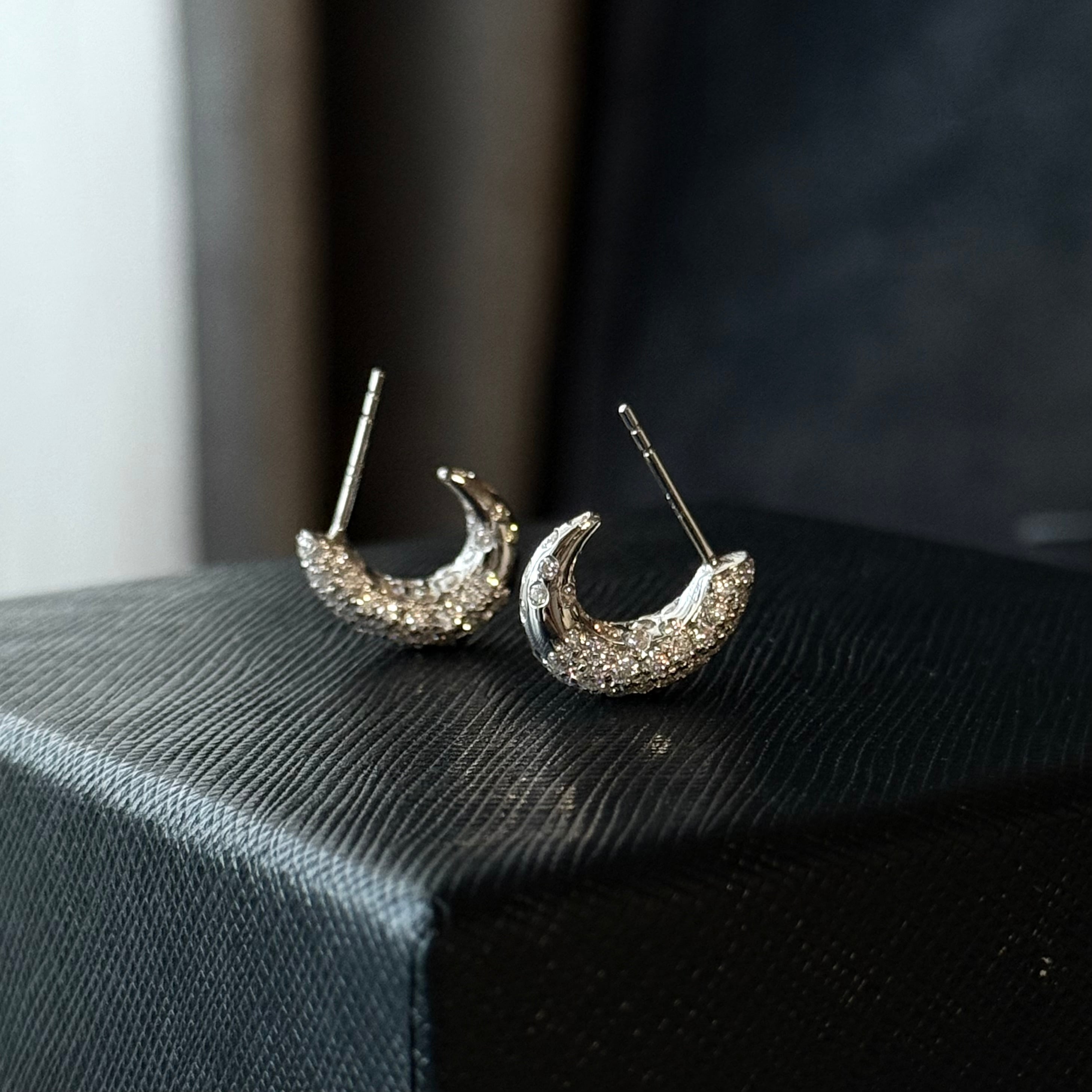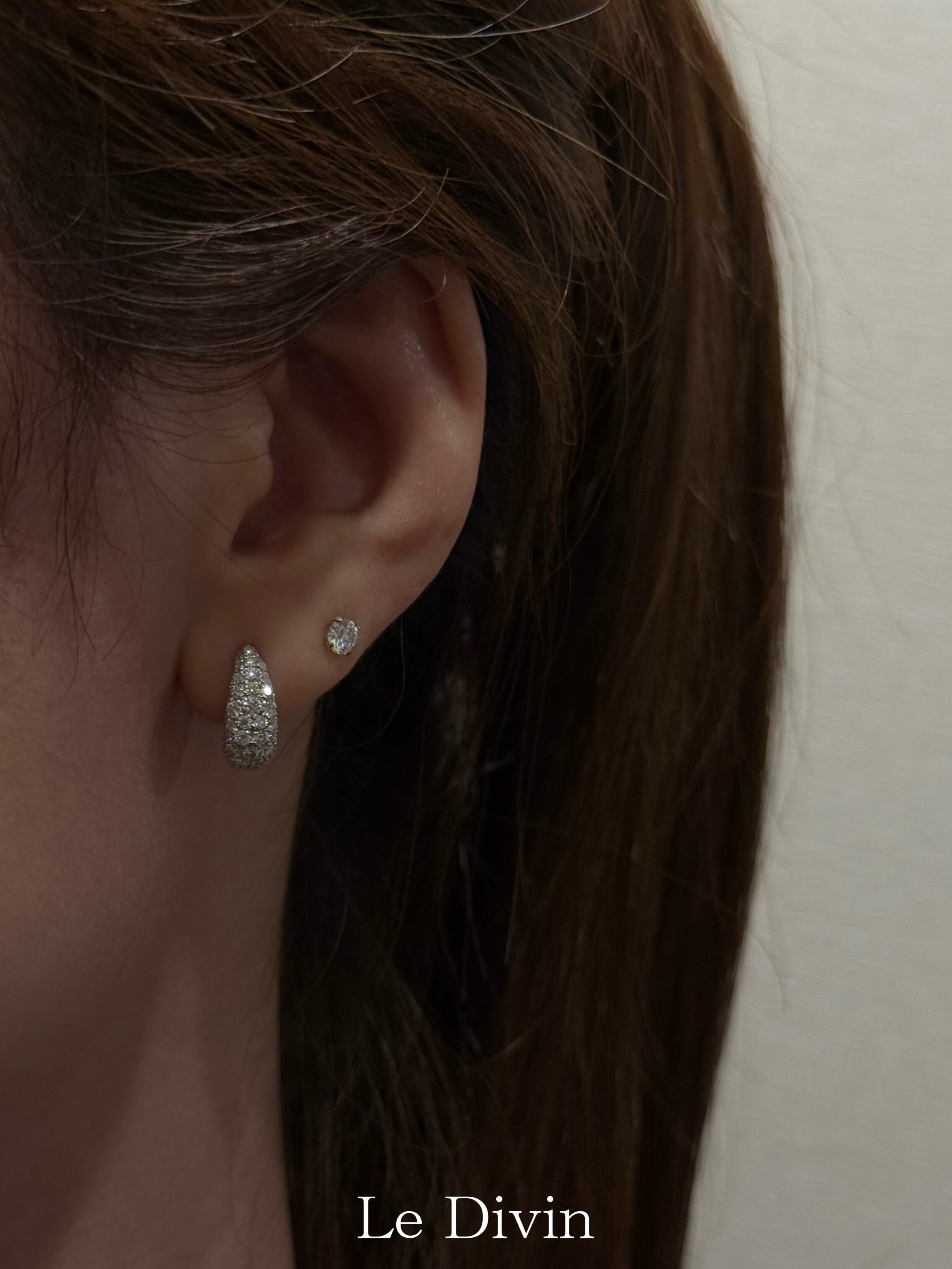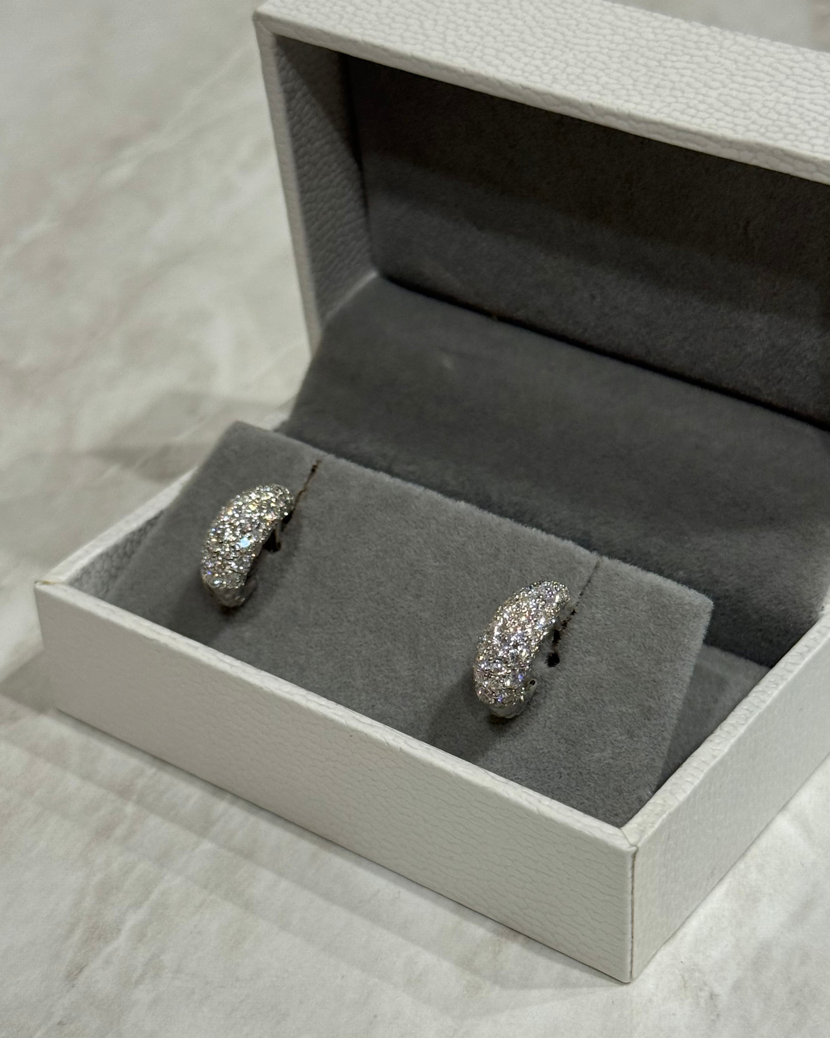 ぽってりとしたシルエットが魅力のパヴェピアスです。ランダムサイズの石を使用することで散りばめられたような煌めきが耳元を彩ります。銀をたっぷりと使用しており、程よい重みでより高級感を感じていただけます。