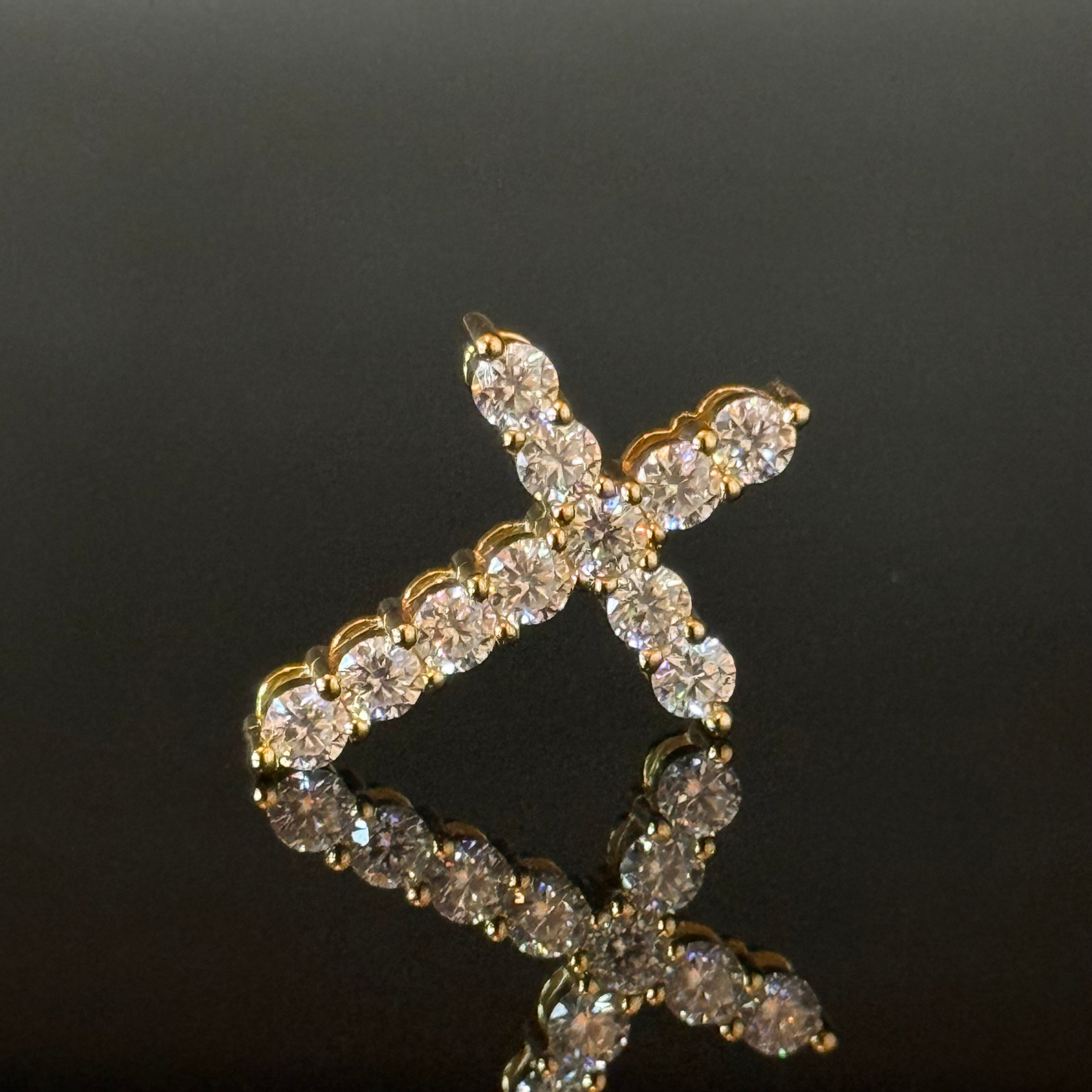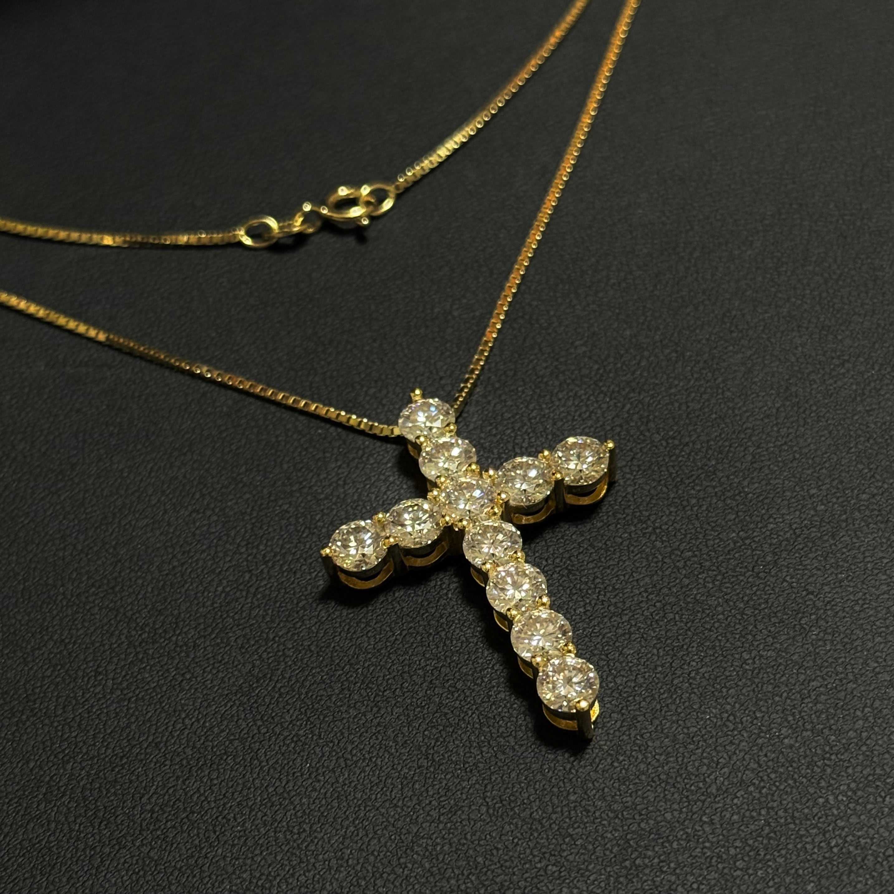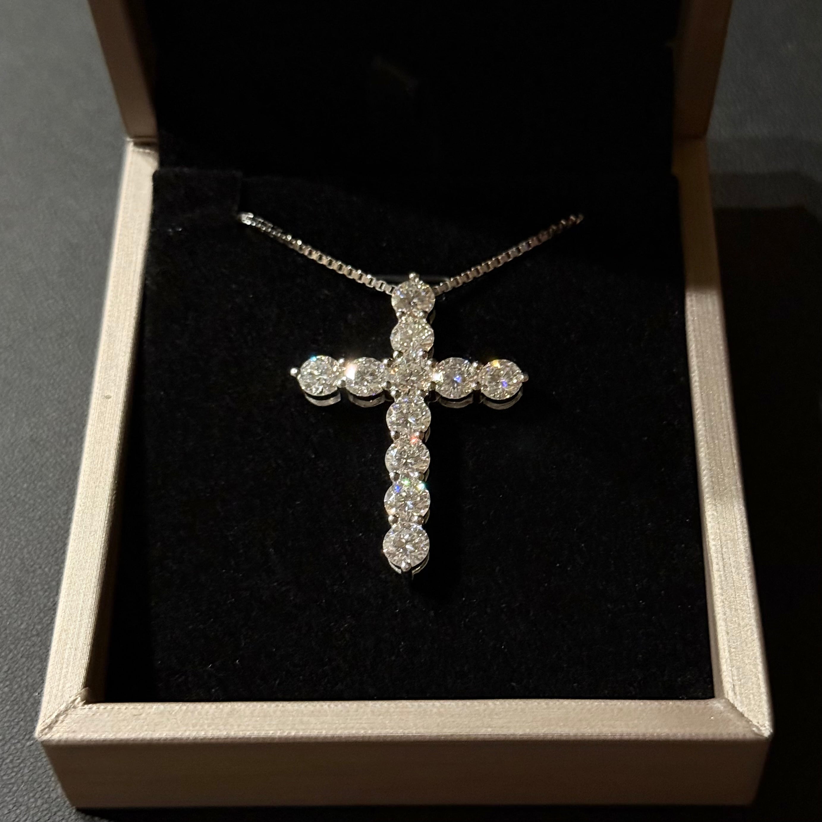 【後悔させない輝きをお届け】11粒の上質なモアサナイトを職人さんが一つ一つ丁寧にセッティング、研磨、コーティングをして仕立て上げる贅沢なクロスネックレスです。1.2mm~1.5mmの存在感があるベネチアンチェーンで男らしさをプラス!女性には0.8mmチェーンがオススメです。オールシーズンで様々なシーンに映える万人受けのデザインです。ダイヤモンドに引けをとらないD色/VVS1の美しい輝きをご堪能いただけます。