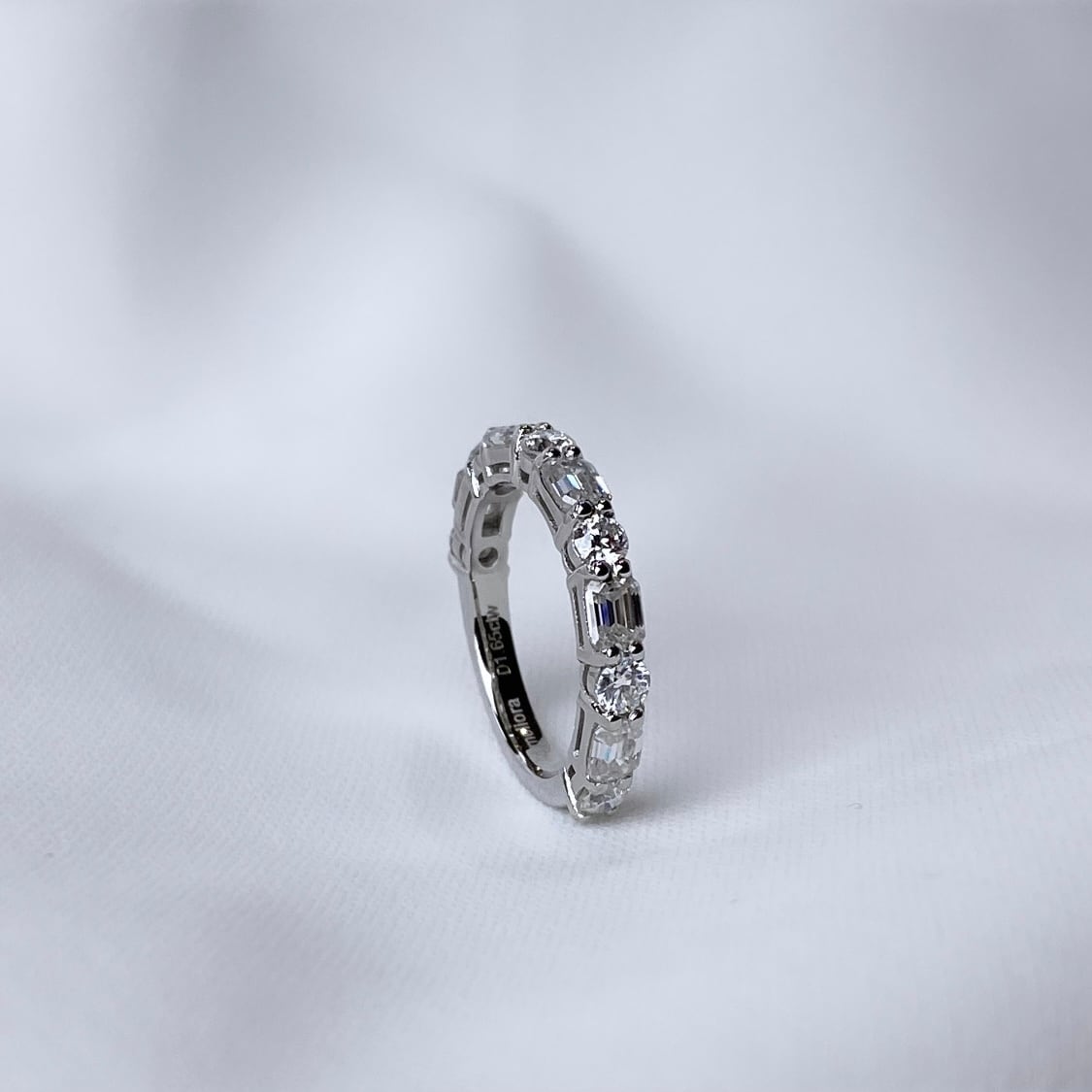 ダイヤモンドの2.5倍輝く上質なモアサナイトを使用したハーフエタニティリング*。