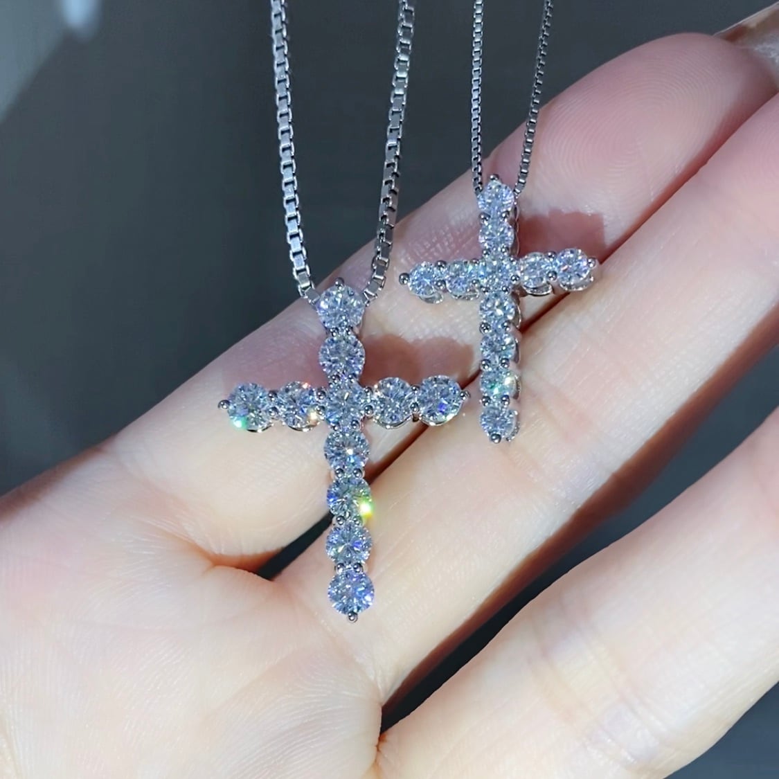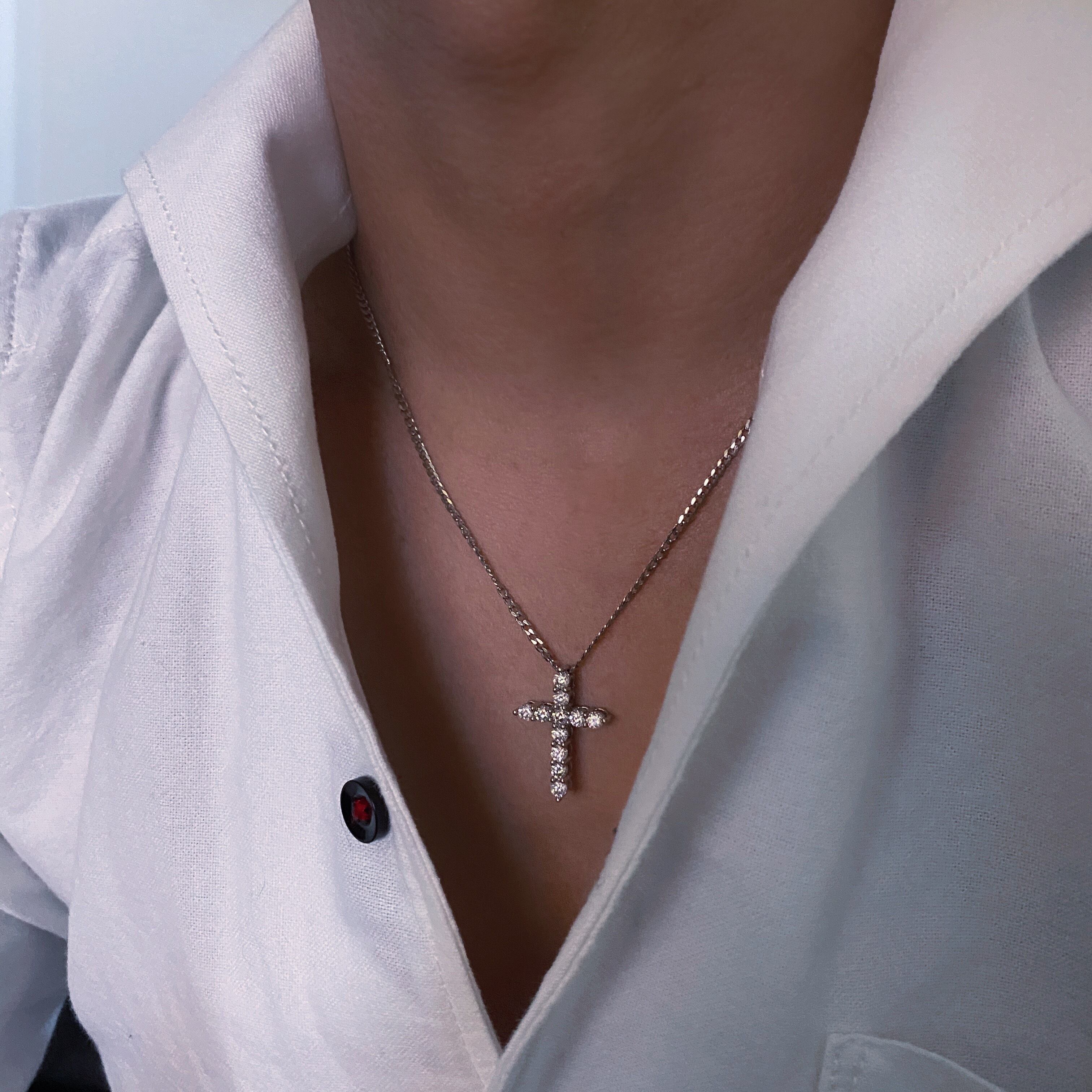 光が差し込む空間のある土台に高品質なDcollar/VVs1のモアサナイトが綺麗にセッティングされた高級感のあるクロスネックレス。無駄を省いたシンプルなデザインがモアサナイトの美しい輝きを際立たせます。幅広いシーンで活躍すること間違いなしの【女性ウケ抜群】ネックレスです。