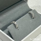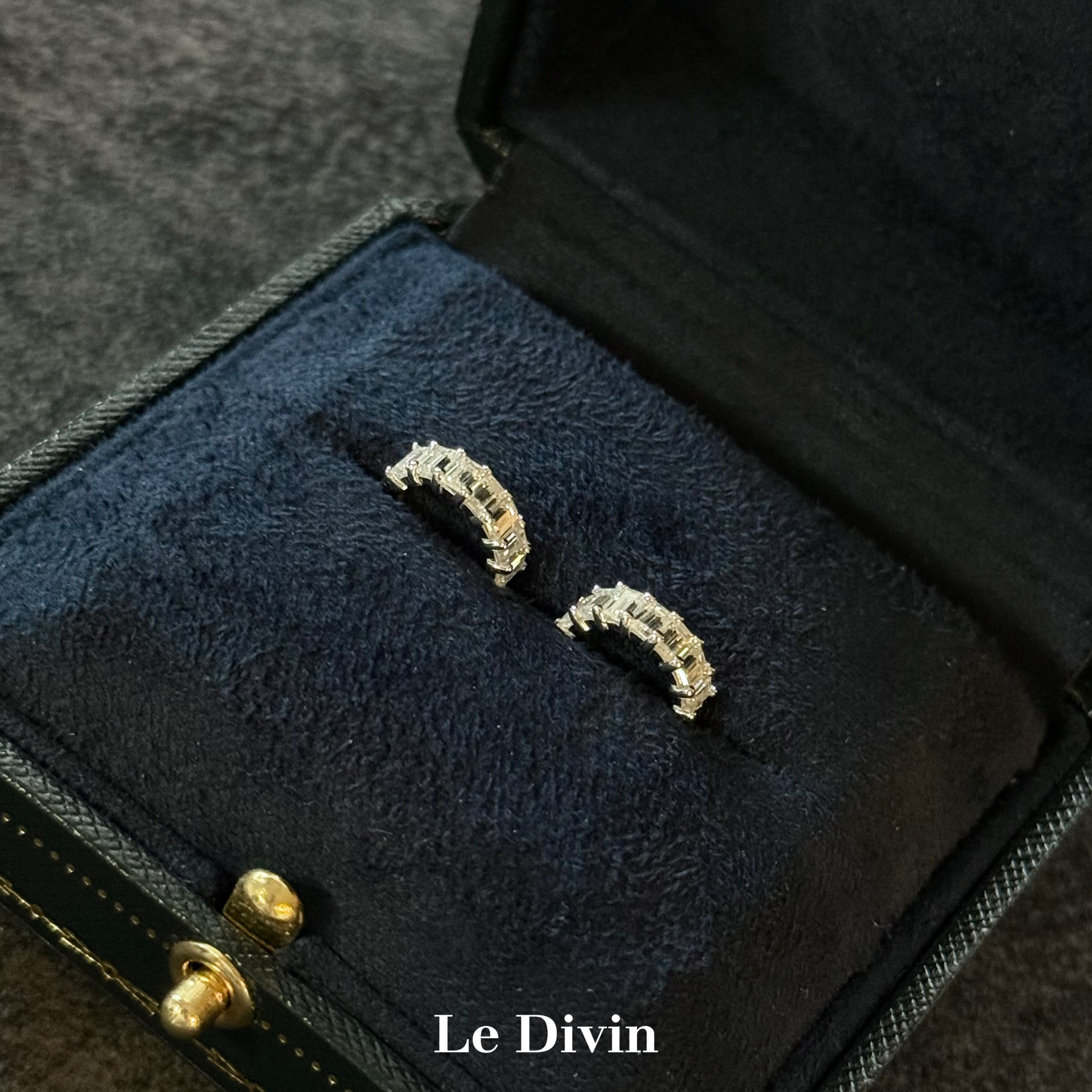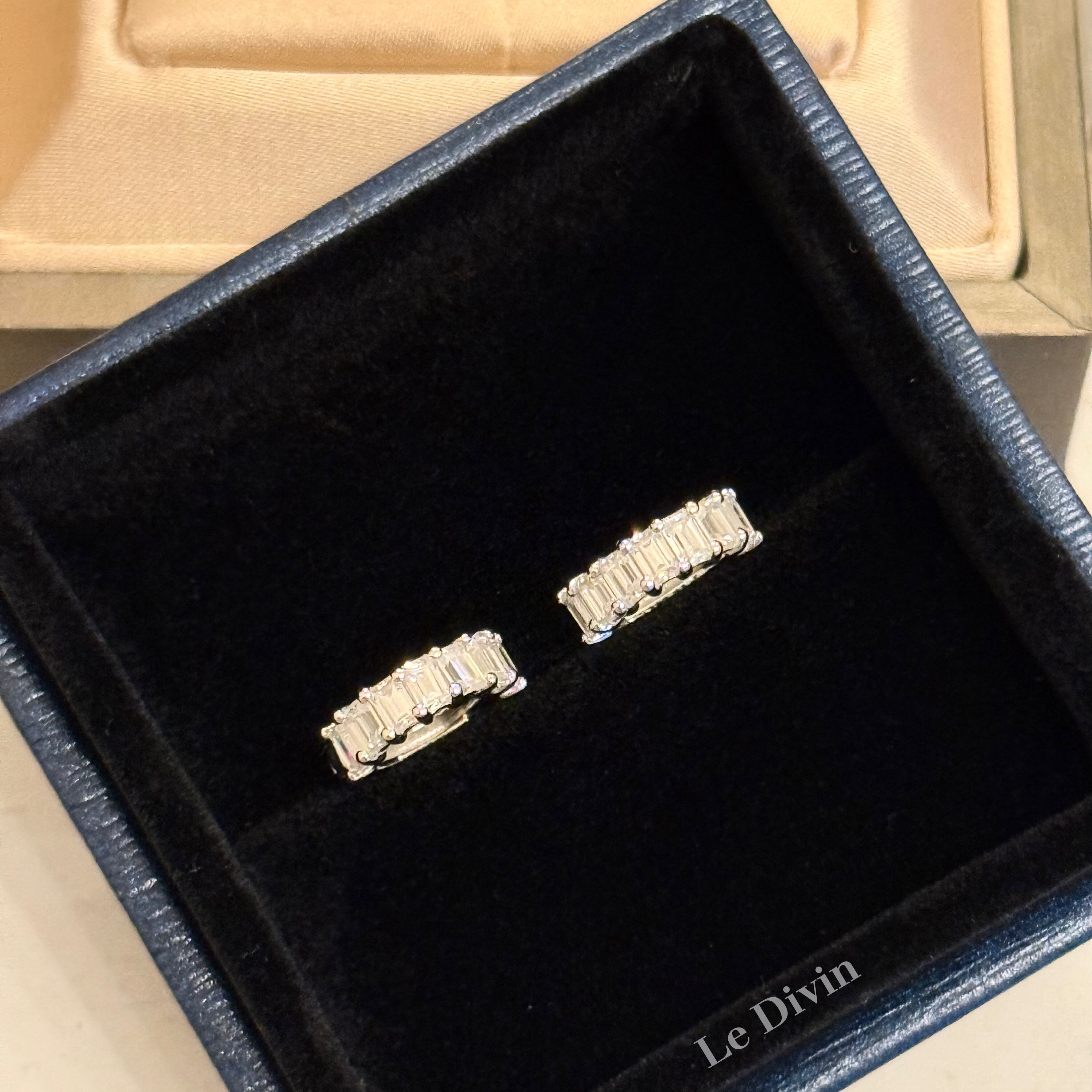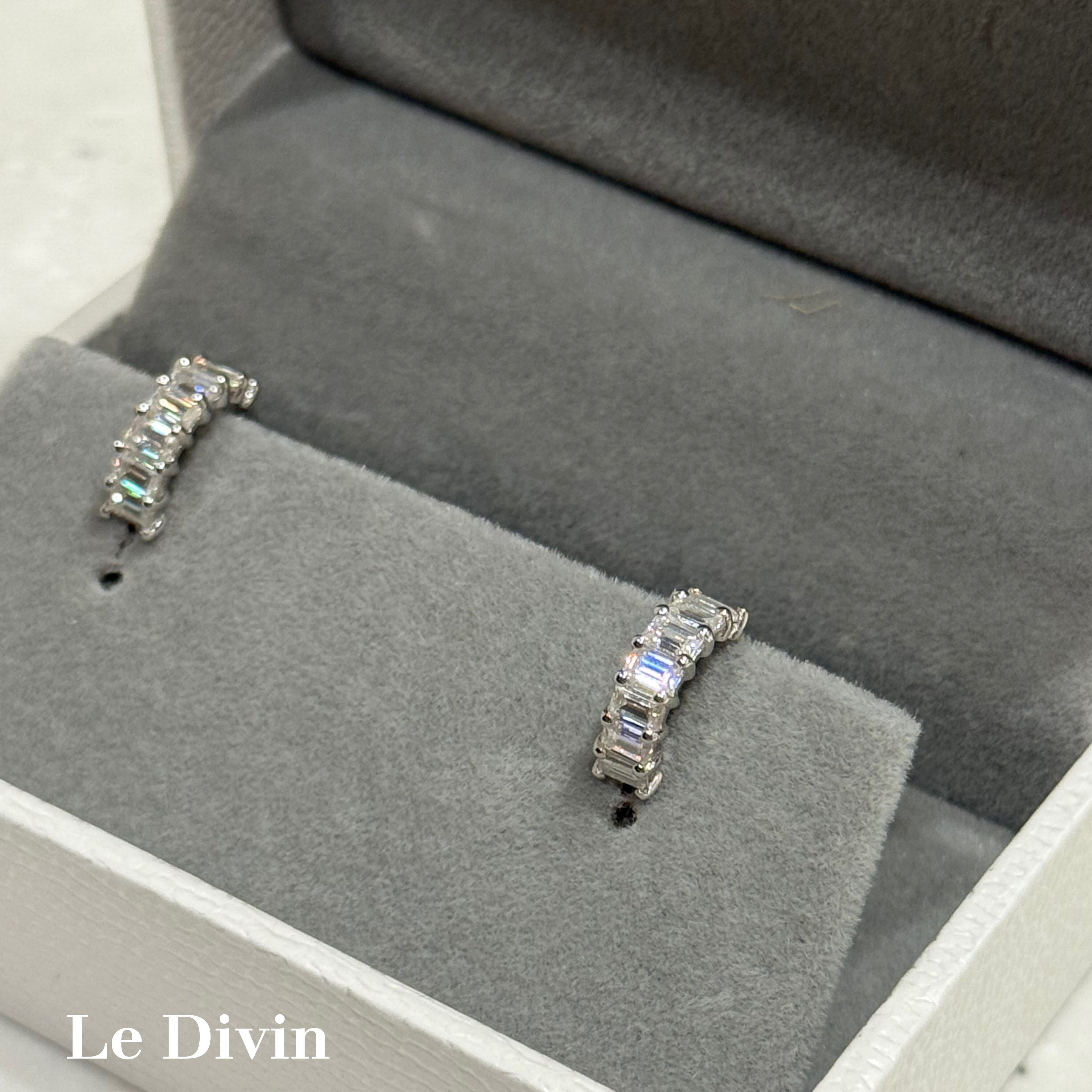 バゲットカットを両耳計14石使用したミニーフープピアス。クールで落ち着いた印象のバゲットカットですが、光の反射によってテーブル面全体が強く輝きます。かっこよくクールな印象なのでメンズにも人気のカットのひとつです。